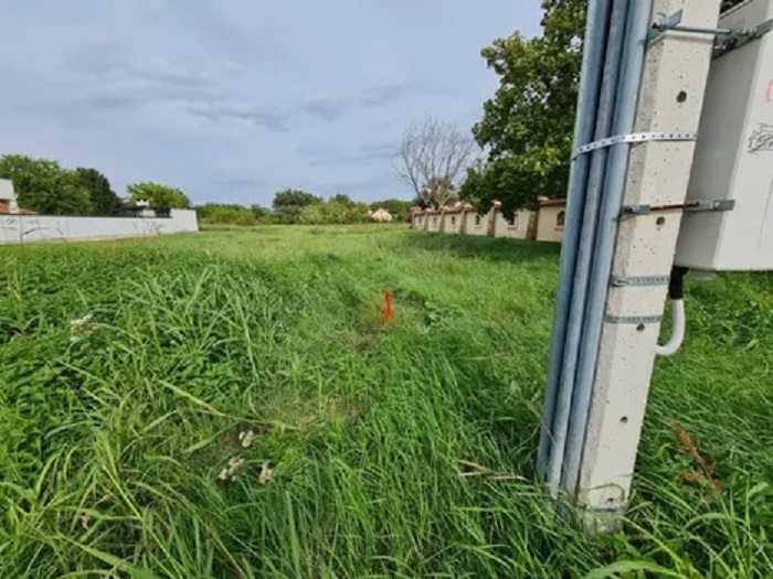 Ekskluzivan građevinski plac površine 705 m2. u naselju Dolina (MZ. Kertvaroš, Subotica) ul. Antona Aškerca br 80. Ulični front 21.5 m (od crvenog stuba do crvenog stuba, prikazano na fotografiji).