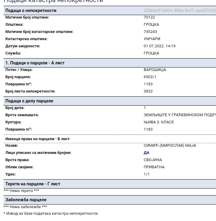 Njiva 3.klase na glavnom putu, prekoputa Zelene pijace. Zemljiste u gradjevinskom podrucju na 650m od autoputa E75. Plac je ogradjen kapijom. Vlasnik Maja Simic Simeunovic 064/230-7372 Ili 069/887-7560